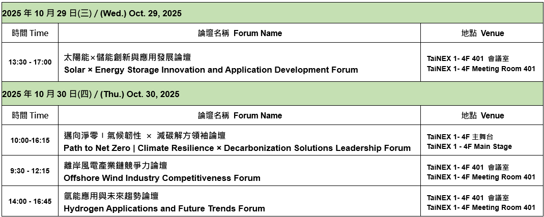 Energy Taiwan & Net-Zero Taiwan Forum 2025: 【Solar × Energy Storage Innovation and Application Development Forum】​, 【Path to Net Zero | Climate Resilience × Decarbonization Solutions Leadership Forum】,【Offshore Wind Industry Competitiveness Forum​】, 【Hydrogen Applications and Future Trends Forum​】. Bringing together global industry and academic experts, these forums focus on net-zero topics such as carbon management, climate technology, energy innovation, and green talent. They will delve into practical challenges including green power trading, carbon credits, AI-driven carbon reduction, and green finance, aiming to co-create an actionable blueprint for a sustainable future. We look forward to your participation!